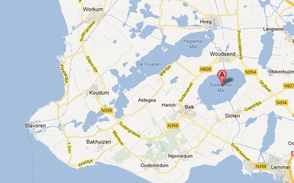 De Zuidwesthoek volgens Google Maps. De voorzitter opperde dat wellicht De Fluessen (Fluezen) kan worden ‘ingezet’ in plaats van het Slotermeer (Sleatermar). Ben benieuwd, hoe die omleiding er, met aandoen van Sloten er dan uit gaat zien. Want het derde stadje op weg van IJlst (op het kaartje ten noorden van Heeg, niet zichtbaar) naar Stavoren overslaan, dat kan natuurlijk niet.