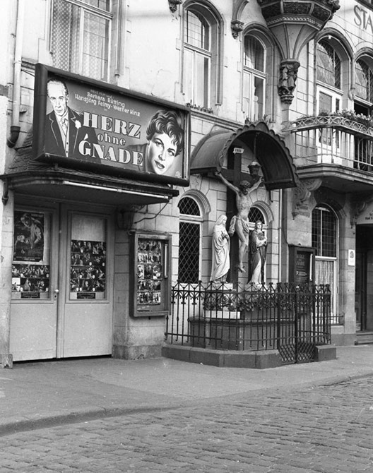 Ik moet nog eens goed in mijn zwart-wit-archief snuffelen, want daarin moet een in Duitsland genomen foto zitten van een bioscoop, geflankeerd door een kruislievenheer, met de aankondiging van een film Herz ohne Gnade. Die foto heeft in 1955 of zo met een stichtelijk onderschrift op Goede Vrijdag op de voorpagina van onder meer het Noordhollands Dagblad gestaan.