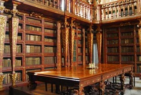 Bij het woord bibliotheek denk ik in de eerste plaats aan een schemerige ruimte in een oud, eerbiedwaardig gebouw, waar in leder gebonden boeken in kasten tot aan het plafond, alleen bereikbaar met een trapleer, zijn gerangschikt. Waar het kraken van de planken vloer, het omslaan van de bladzijden, het krassen van een pen en ’n enkel kuchje het enige gerucht vormen.