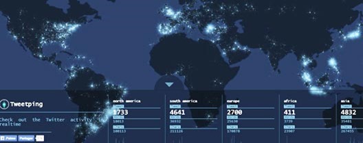 Twitteractiviteit over de hele wereld, vanmiddag tussen 15:50 en 15:55 uur. Wedloop tussen Azië en Latijns Amerika. Bron: Tweetping