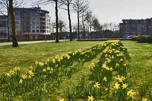 Het stikt van de lentefoto’s op het web, maar vooruit dan maar. Morgen is het weer even (?) voorbij. De bedden narcissen in de Bestse wijk Heivelden gingen vandaag na enige aarzeling open.