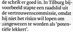 wee bestuurskundigen, onder wie een hoogleraar, vinden een nieuw woord uit: lekkert. Voor iemand die lekt. Maar voor zo’n vondst moet je op z’n minst enig taalgevoel hebben, zo geen –kennis. Je schrijft immers ook niet (een wèl bestaand woord) stinkert. Wel stinkerd, dat vermoedelijk is afgeleid van stinkaard, dus op een d eindigt. Lekkerd dus. Wat we ook wel kennen is het woord lekkertje (snoepje), voor een leuk kind. Maar ja, dat komen we bij mijn weten alleen maar in verkleinde vorm tegen.