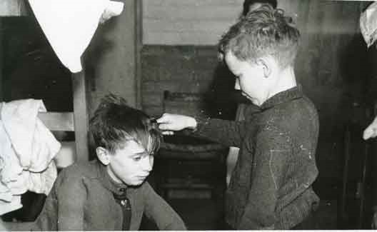 Een jongetje kamt zijn kamergenootje, mogelijk zijn broer, tijdens het verblijf in Engeland. Fotograaf onbekend.