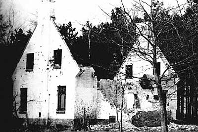 ![]() De ruïne van het boswachtershuis zoals die nog jaren na de bevrijding is blijven staan. Let op de tientallen kogelgaten. De foto, waarvan de maker onbekend is, staat op het internet. |